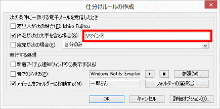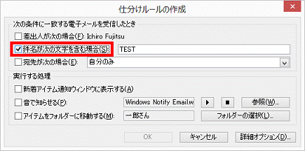 「件名が次の文字を含む場合」にチェックが付いていることを確認します。