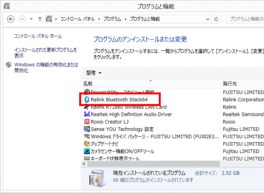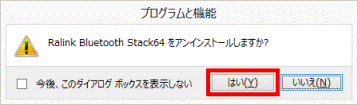 「名前」の一覧に「Ralink Bluetooth Stack64」がないときは、「×」ボタンをクリックし「プログラムと機能」を閉じてから「インストール手順」に進みます。 - 「Ralink Bluetooth Stack64 をアンイストールしますか?」と表示されます。