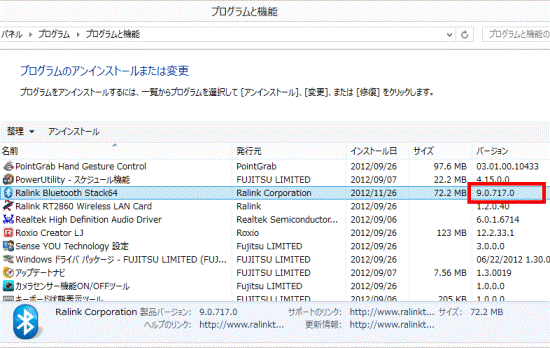 「名前」の一覧から、「Ralink Bluetooth Stack64」をクリックします。
