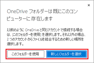 「OneDrive フォルダーは既にこのコンピューターに存在します」と表示された場合は、「このフォルダーを使用」ボタンをクリックします。