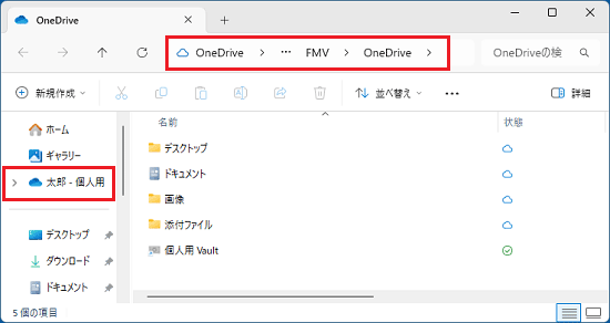 (ローカルアカウントのユーザー名が「FMV」、Microsoft アカウントのユーザー名が「山田太郎」の場合)