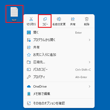 ここでは例として、デスクトップにあるファイルを、パソコン内とオンライン上のOneDriveにコピーする手順を説明します。