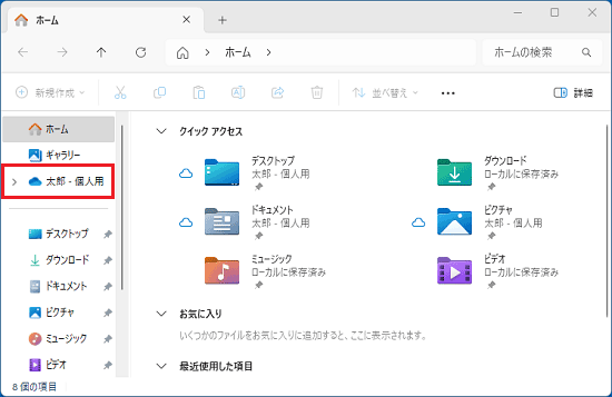 3. エクスプローラーにOneDriveのアイコンとユーザー名などが表示されたことを確認します。