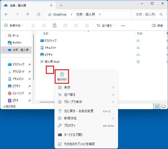4. OneDriveフォルダーの何も無いところを右クリックし、表示されるメニューから「貼り付け」アイコンをクリックします。