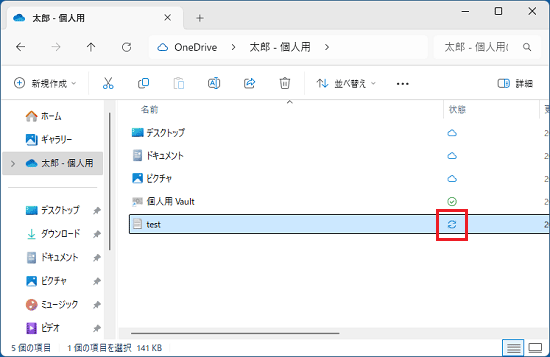5. コピーしたファイルのアイコンの右側に、同期中を示す青い矢印マークが表示されます。
