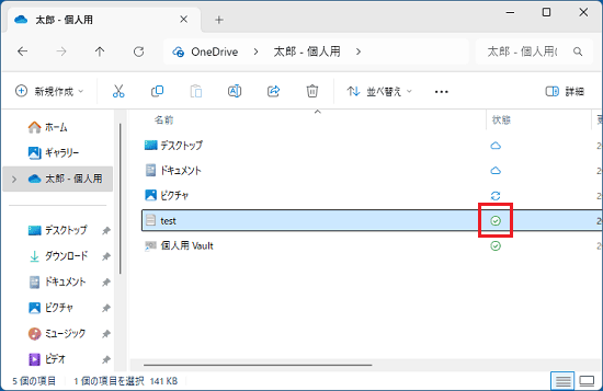 • OneDriveと同期しているフォルダーやファイルには、青い雲やチェックマークのアイコンが付きます。