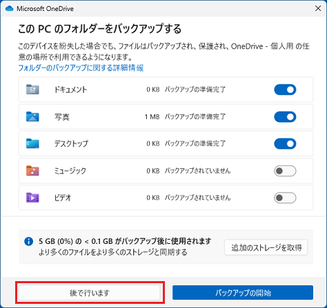 「バックアップの開始」をクリックすると設定できる内容は、上の「OneDriveと「デスクトップ」「ドキュメント」「ピクチャ」「ミュージック」「ビデオ」を同期するかどうかを変更する」と同じです。