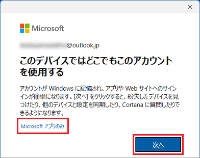 入力したMicrosoft アカウントを他のアプリでも使う場合は、「次へ」ボタンをクリックします。