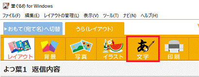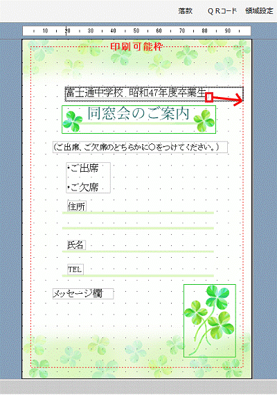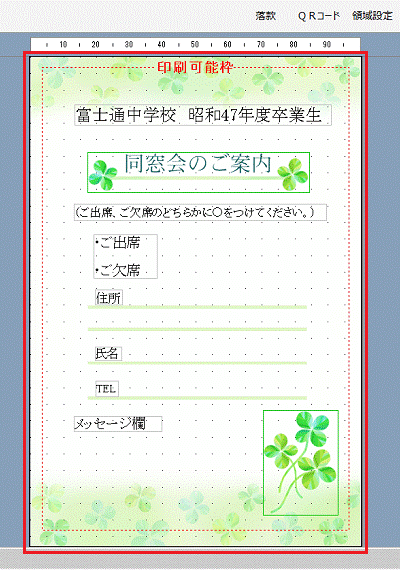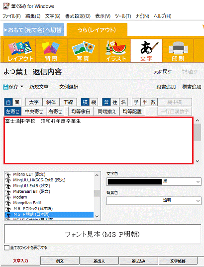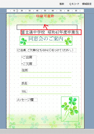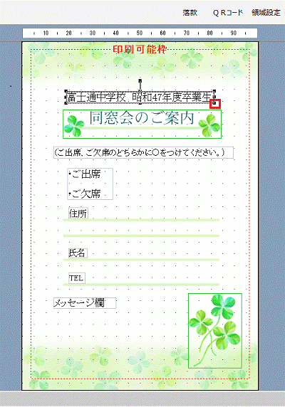 例として、筆ぐるめ 23でサンプルレイアウトの「よつ葉1 返信内容」を編集して出欠確認のレイアウトを作成します。