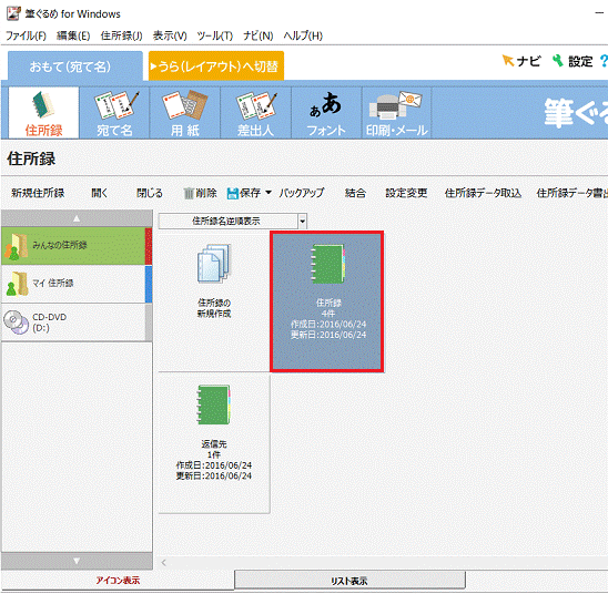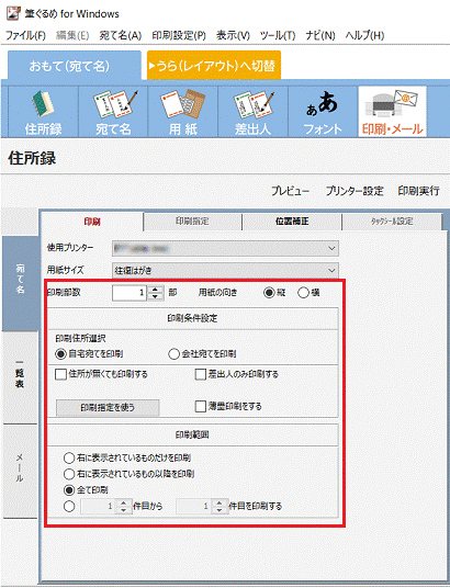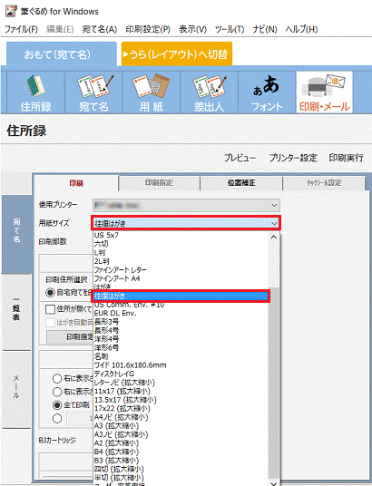 完成したら、往信はがきの宛先にしたい住所録を開き、往復はがきのレイアウトを選択して印刷します。