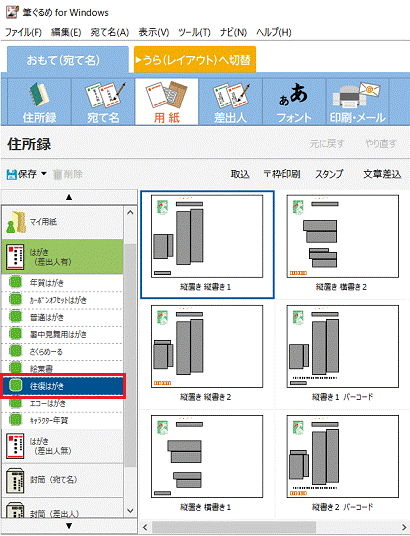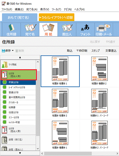 - 「はがき(差出人有)」または「はがき」をクリックします。
