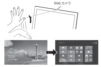 スタート画面で左右に素早く手を振ると(スワイプ)、画面が左右にスクロールします。