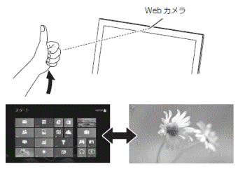 親指を立てて、下からカメラに映るように手を上げると(サムアップ)、スタート画面と直前に表示していた画面が切り替わります。
