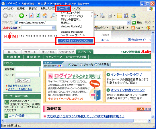 - 「ツール」メニュー→「インターネットオプション」の順にクリックします。
