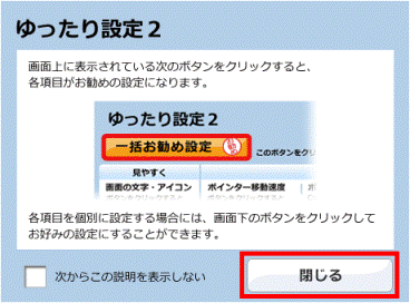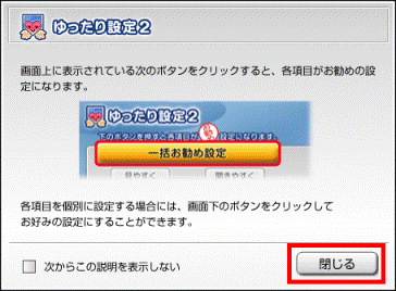 「画面上に表示されている次のボタンをクリックすると、各項目がお勧めの設定になります。」と表示された場合は、「閉じる」ボタンをクリックします。