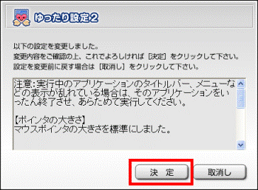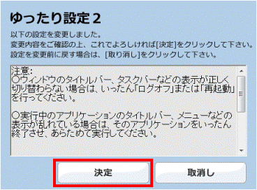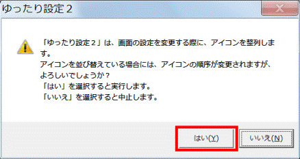 - 「「ゆったり設定2」は、画面の設定を変更する際に、アイコンを整列します。」と表示された場合は、デスクトップのアイコンが並び替えられても問題がないことを確認します。