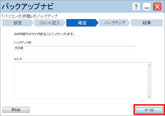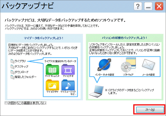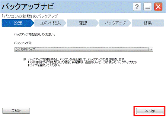 バックアップナビについての説明をよく読み、「次へ」ボタンをクリックします。