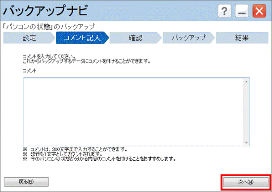 必要に応じて、バックアップするデータに付けるコメントを入力します。