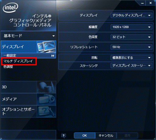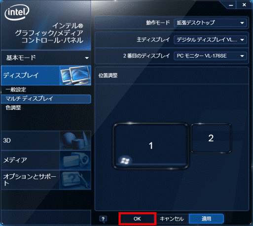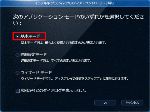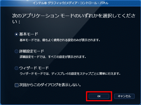- 「OK」ボタンをクリックし、「インテル グラフィック / メディア コントロール・パネル」を閉じます。