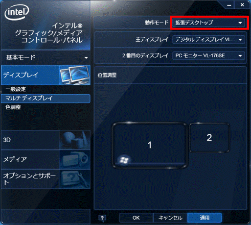 - 「動作モード」の「▼」ボタンをクリックし、表示される一覧から「拡張デスクトップ」をクリックします。