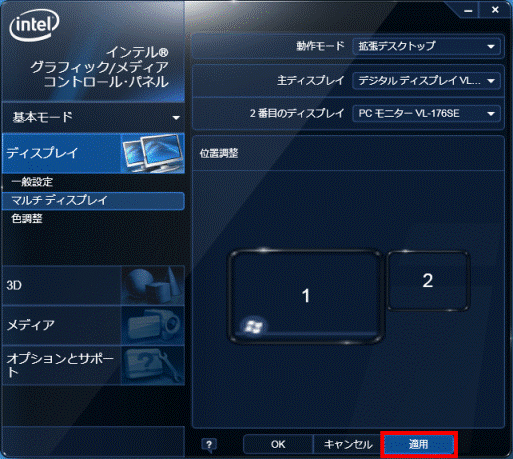 - 「適用」ボタンをクリックし、ディスプレイを切り替えます。