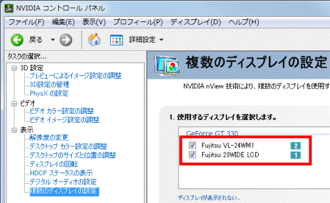 「タスクの選択...」の「ディスプレイ」にある「複数のディスプレイの設定」をクリックします。 - 「1. 使用するディスプレイを選択します。」の一覧から、使用するディスプレイをクリックし、チェックを付けます。