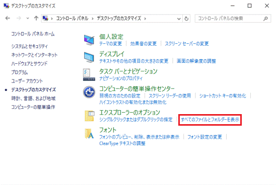 「エクスプローラーのオプション」にある「すべてのファイルとフォルダーを表示」をクリックします。