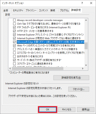 「Microsoft Edge を開くボタン([新しいタブ] ボタンの隣) を非表示にする」の設定を有効にするには、Internet Explorerの再起動が必要です。 - 「×」ボタンをクリックし、Internet Explorer を終了します。