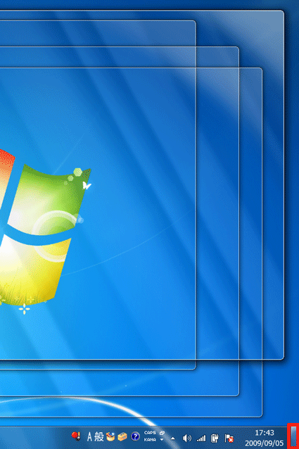 タスクバーの右端の「デスクトップの表示」にマウスポインターを合わせると、すべてのウィンドウが透明になります。