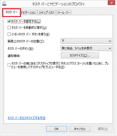 タスクバーが表示されない場合は、「コントロールパネル」を表示し、「デスクトップのカスタマイズ」→「タスクバーとナビゲーション」(または「タスクバー」)の順にクリックします。