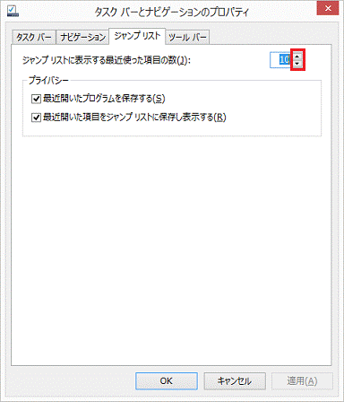 9. 「ジャンプリストに表示する最近使った項目の数」に、「10」と表示されていることを確認します。
