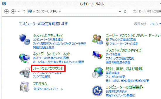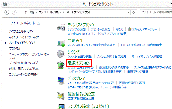 表示方法が「大きいアイコン」または「小さいアイコン」の場合は、「電源オプション」アイコンをクリックし、手順7.に進みます。 - 「ハードウェアとサウンド」が表示されます。