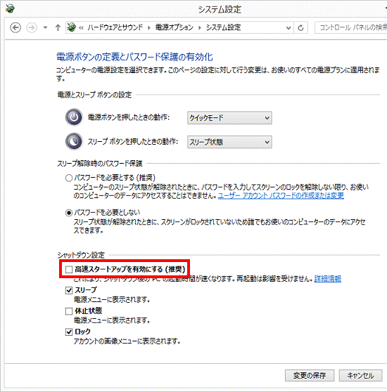 高速スタートアップを無効にすると、Windows を終了(シャットダウン)した後に、電源を入れてから起動するまでの時間が、有効な状態に比べて長くなります。