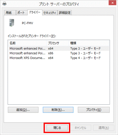 19. 「閉じる」ボタンをクリックし、「プリントサーバーのプロパティ」を閉じます。