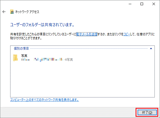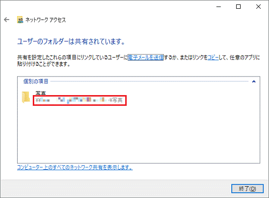 - 「ユーザーのフォルダーは共有されています。」と表示されます。