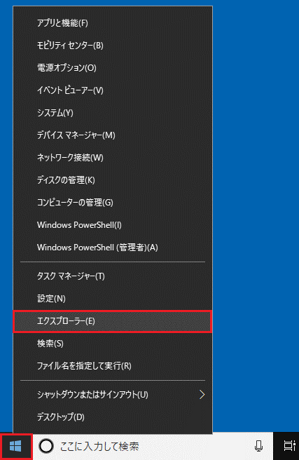- 「スタート」ボタンを右クリック→「エクスプローラー」の順にクリックします。