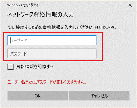 アドバイス「ネットワーク パスワードの入力」と表示されたときは、手順3.で選択したパソコンに設定されているユーザー名とパスワードを入力し、「OK」ボタンをクリックします。