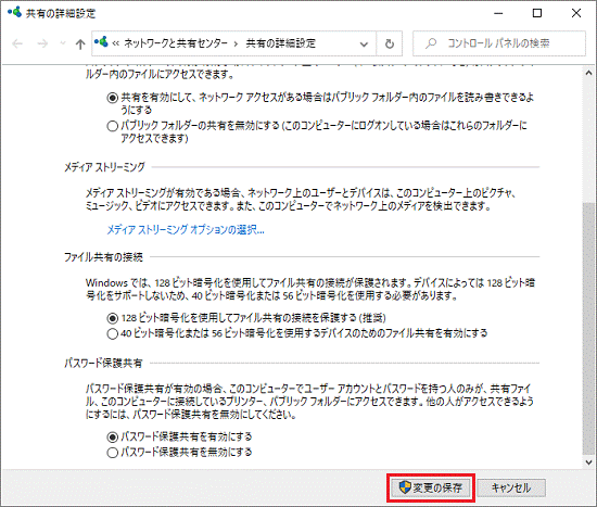 - 「パスワード保護共有」で、他のパソコンから、お使いのパソコンにアクセスしたときに、ユーザー名とパスワードの入力を求めるかどうかを、お好みで設定します。