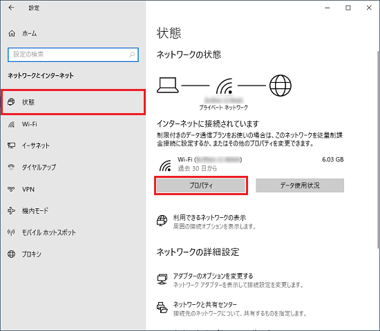 「状態」をクリックし、「Wi-Fi」や「イーサネット」の「プロパティ」ボタンをクリックします。