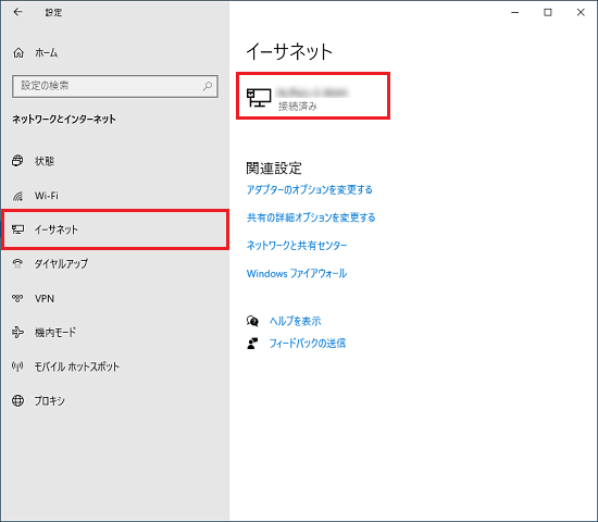 「イーサーネット」をクリックし、右側の項目の「接続済み」アイコンをクリックします。