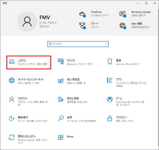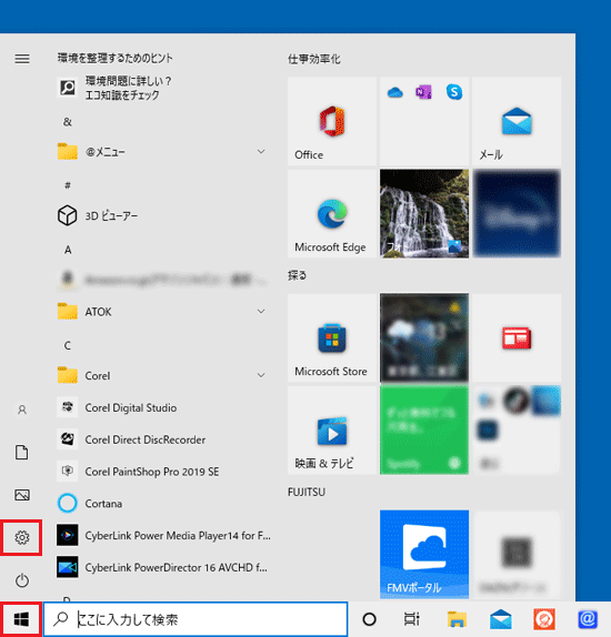 - 「スタート」ボタン→「設定」の順にクリックします。