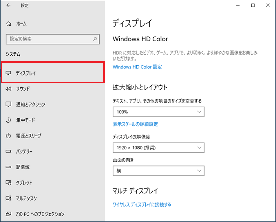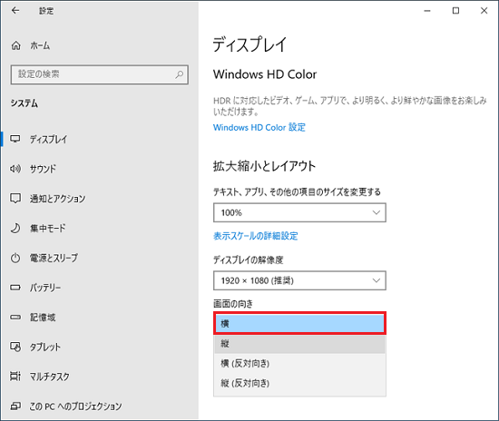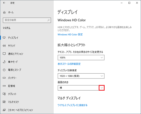 アドバイス「画面の向き」がグレーで変更できない場合は、「回転ロック」のスイッチをクリックして「オン」にしてから、設定を変更してください