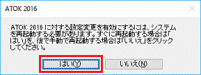 - 「ATOK 2016 に対する設定変更を有効にするには、システムを再起動する必要があります。」と表示されます。