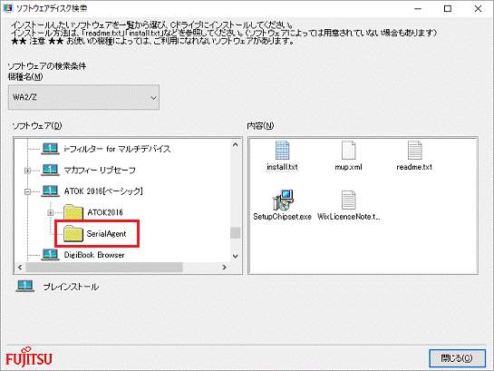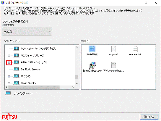- 「ソフトウェア」欄にある「ATOK 2016[ベーシック]」の左側にある「+」をクリックします。