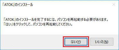 - 「「ATOK」のインストールを完了するには、パソコンを再起動する必要があります。」と表示されます。