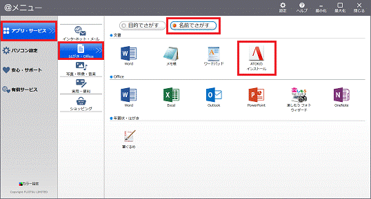 「アプリ・サービス」→「はがき・Office」→「名前でさがす」→「ATOKのインストール」の順にクリックします。