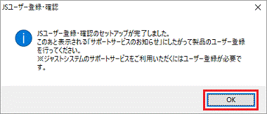 - 「JSユーザー登録・確認のセットアップが完了しました。」と表示されます。
