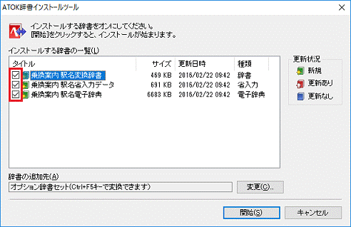 - 「インストールする辞書をオンにしてください。」と表示されます。