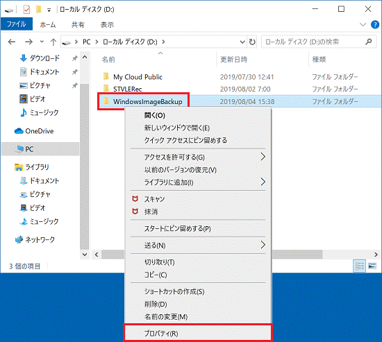 - アクセスする許可を取得したら、「WindowsImageBackup」フォルダーを右クリックし、表示されるメニューから「プロパティ」をクリックします。