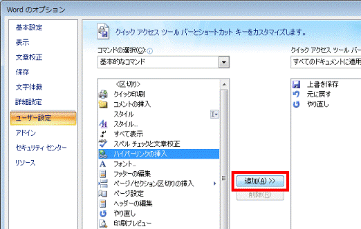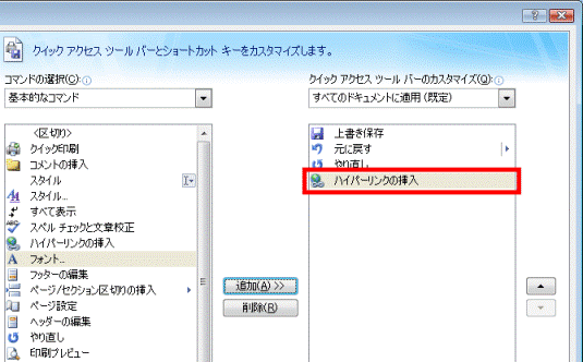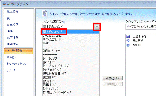 - 「追加」ボタンの右側に、現在クイック アクセス ツールバーに表示されているコマンドの一覧があります。